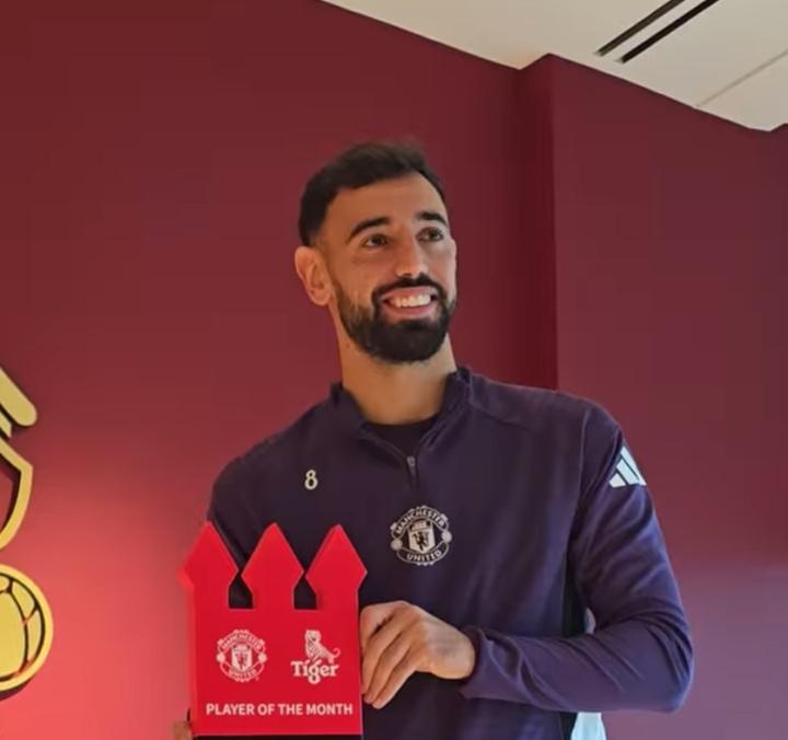 (舞台灯光亮起,主持人手持话筒站在场地中央)布鲁诺-费尔南德斯荣膺曼联九月最佳球员,此刻正在卡灵顿训练基地接受这份殊荣。